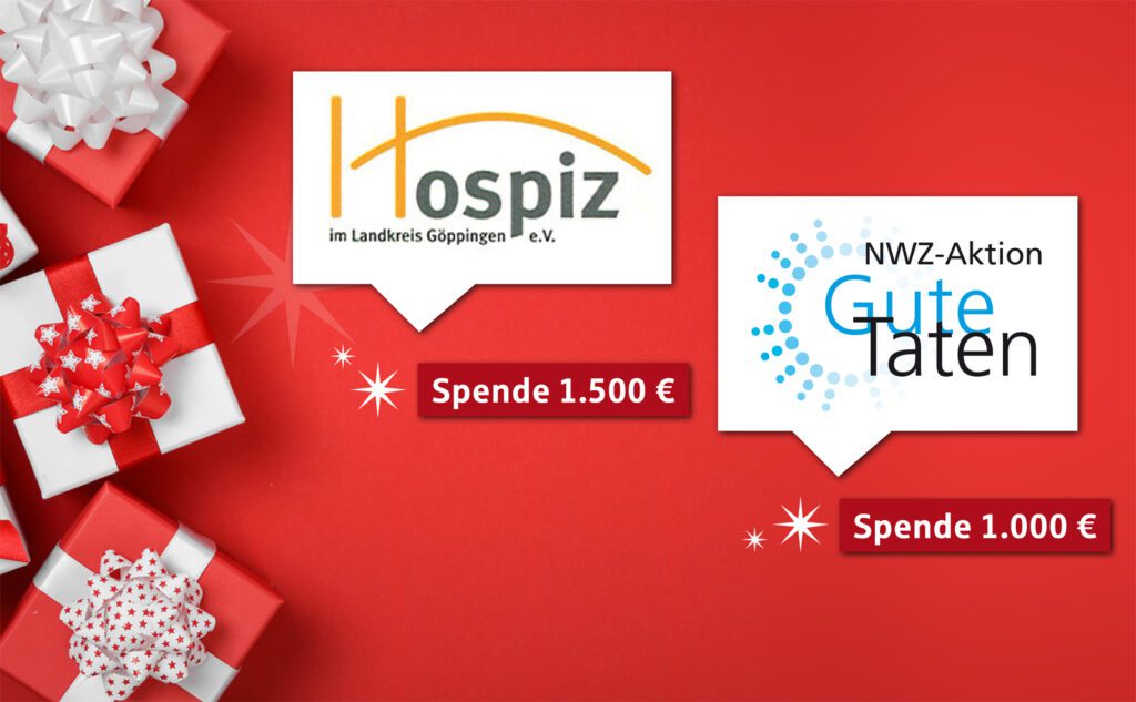 In diesem Jahr haben wir 1.500 € an das „Hospiz im Landkreis Göppingen e.V.“ und 1.000 € die „NWZ-Aktion Gute Taten“ gespendet. Aus diesem Grund verzichten wir wieder auf Geschenke und Weihnachtskarten für unsere Geschäftspartner! www.hospiz-goeppingen.de Wir wünschen allen frohe Weihnachten & ein gesundes, neues Jahr!