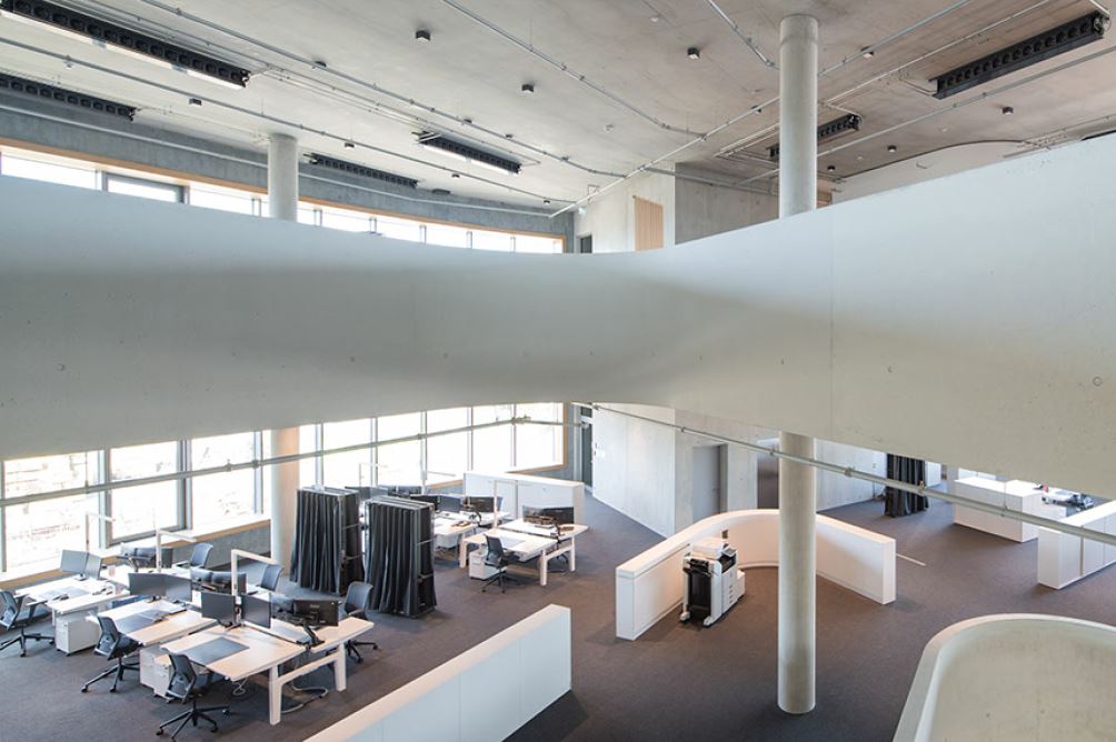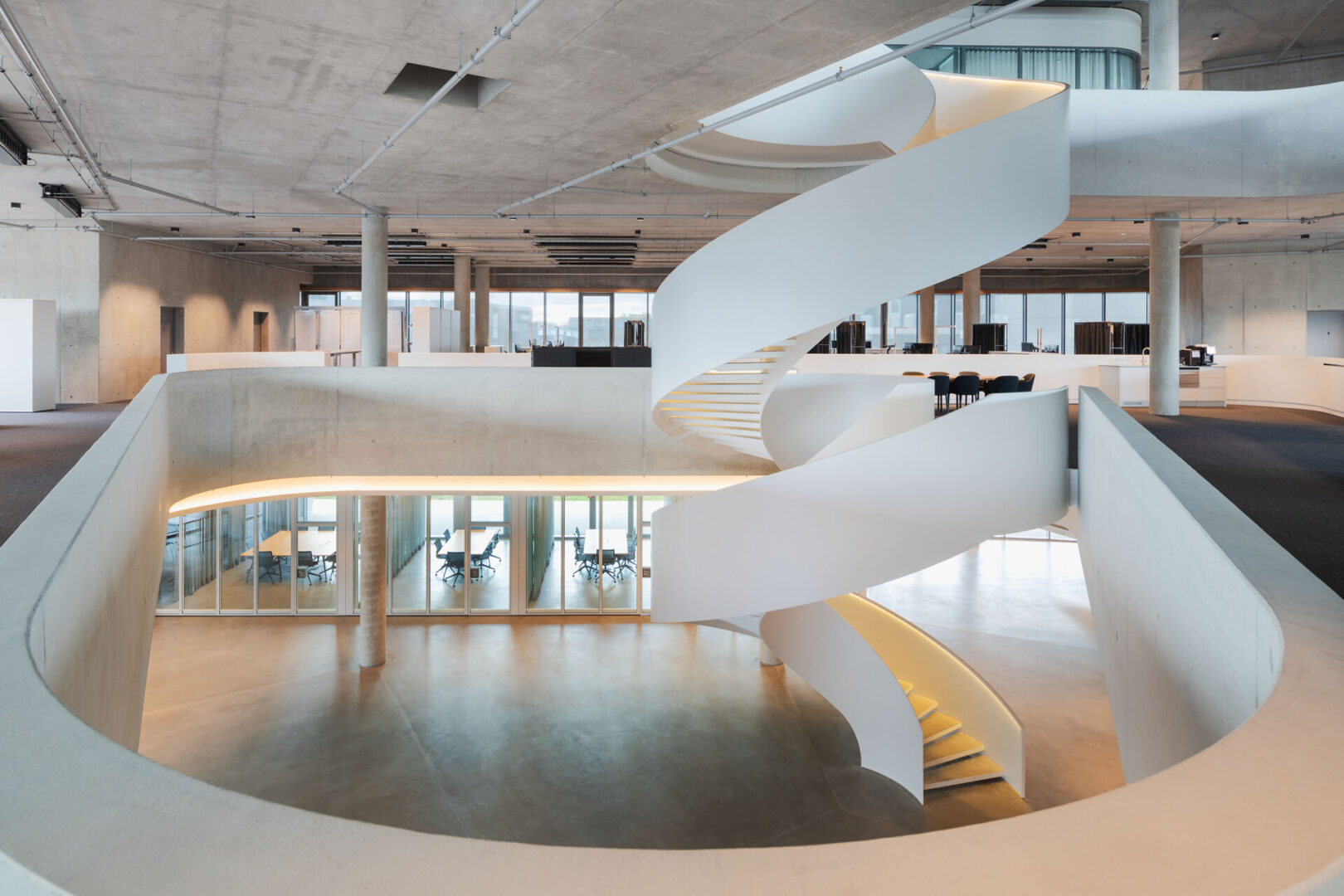 Im Inneren bildet das zentrale Atrium, das kommunikative Herzstück des Gebäudes. Als offener Verteilerraum mit eindrucksvoller weißer Stahlwendeltreppe verbindet es sämtliche Ebenen auf elegante Weise und schafft Transparenz, Offenheit und eine besondere Arbeits- und Aufenthaltsqualität. Die Fläche eignet sich zudem hervorragend für Empfänge, Präsentationen, interne Veranstaltungen oder eine Nutzung als Aula mit bis zu 199 Personen.